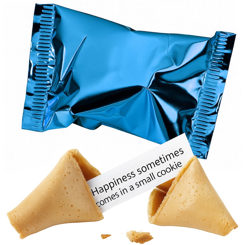 Lykkekaker uten trykk. Du bestemmer selv opptil fem ulike budskap som skal være inni kakene. Hvert budskap kan bestå av opptil 125 tegn, inkludert mellomrom. Teksten trykkes i svart. Det er ikke mulig med trykk på selve folien.