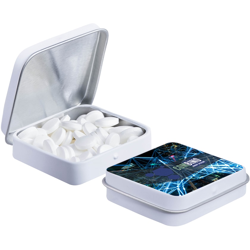 Oppfriskende mintpastiller i eske av metall. Hele lokket trykkes med digitaltrykk. Mintpastillene har hele 36 måneders holdbarhet.