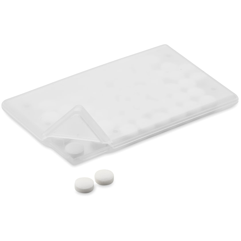Rektangulært freshcard med sukkerfrie mintpastiller. Finnes i flere transparente farger og i hvitt. En klassiker blant reklamegodteri.