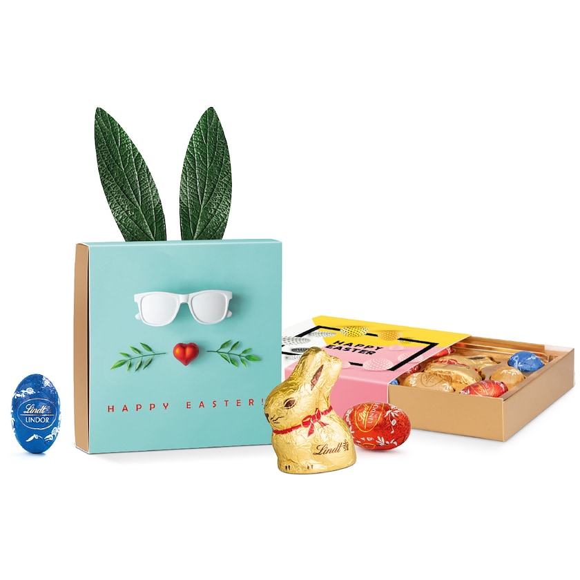 Boks med kaninører fylt med sjokolade fra Lindt. Inneholder 6 stk Lindt sjokoladeegg samt en påskehare fra Lindt pakket i gullfolie. Kaninørene og papirhylsen på boksen trykkes helt etter dine egne ønsker.