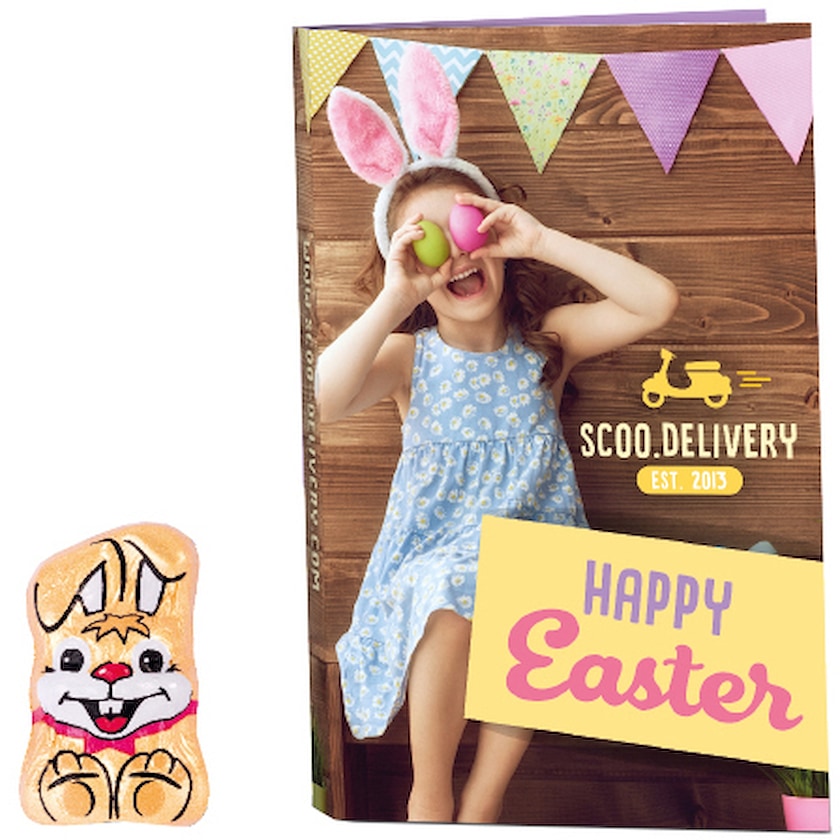 Kort med en påskehare av sjokolade festet på innsiden Kortet digitaltrykkes etter ønske. Her finnes det godt med plass til et kraftig reklamebudskap!