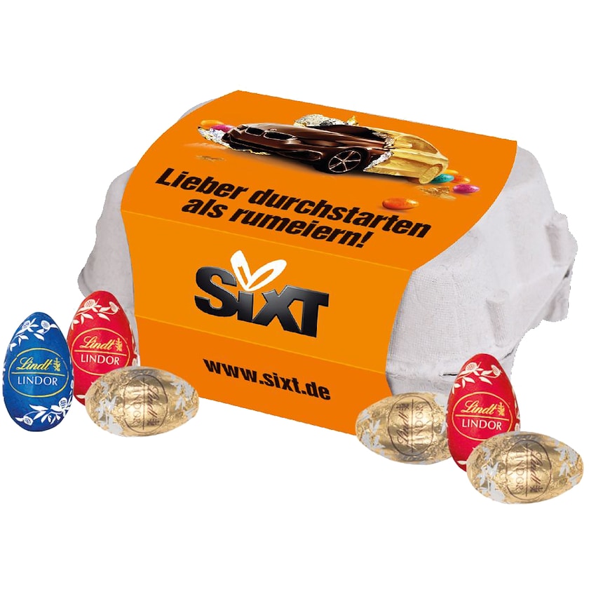 6 stk. sjokoladeegg i en klassisk eggekartong. Sjokoladeeggene leveres i blandede smaksvarianter som hviler på en bunn av kunstig gress. Trykket gjøres på et bånd som knytes rundt eggekartongen.