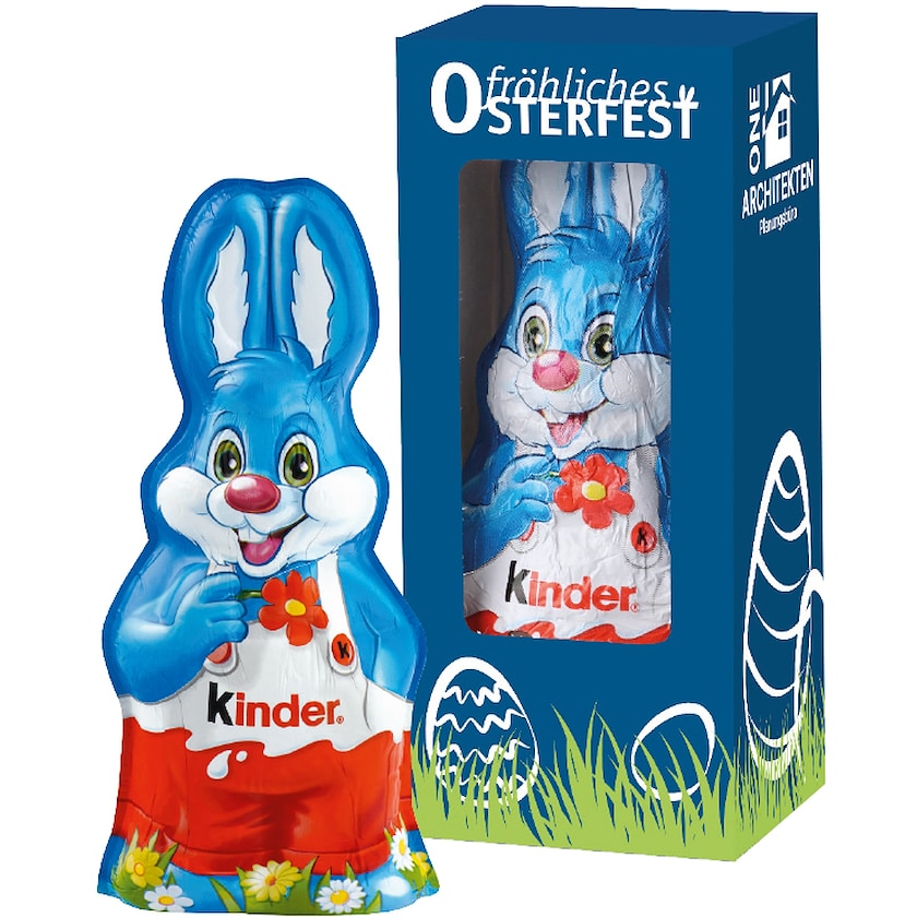 Harry the Bunny fra Kinder i forpakning med ditt eget trykk. En favoritt blant store og små barn! Forpakningen er laget av FSC-sertifisert papir som er produsert klimanøytralt. Last ned trykkmalen lag din helt unike påskesjokolade!