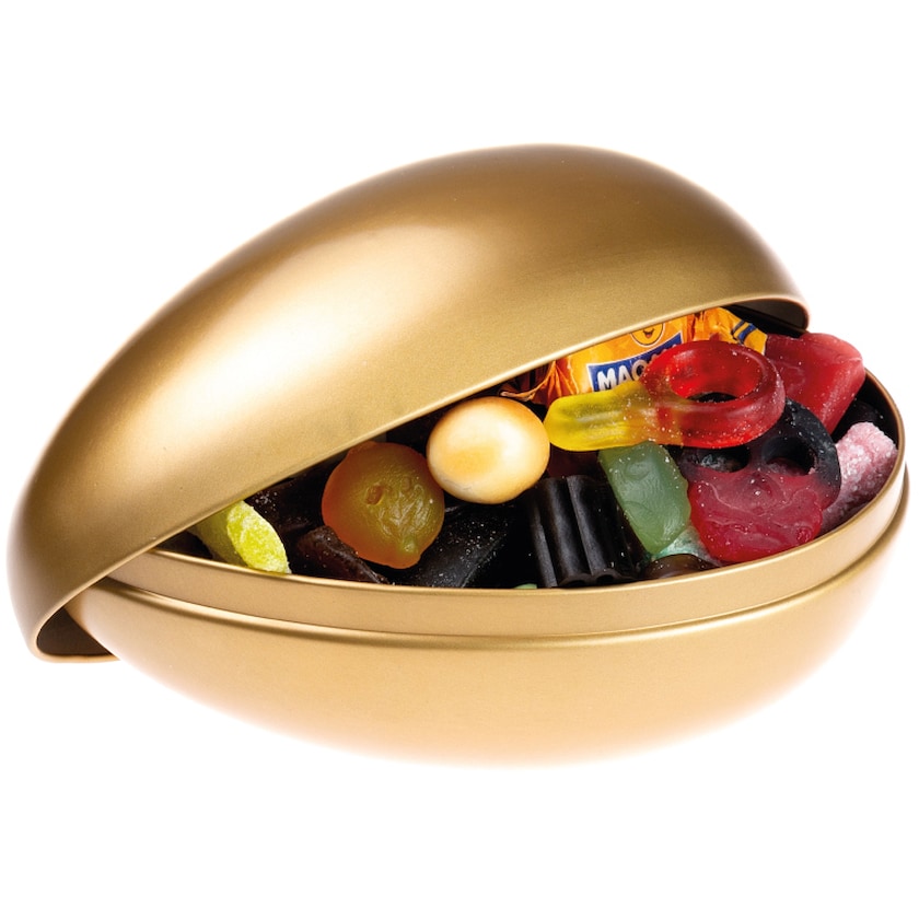 Påskeegg av metall fylt med en blanding av sjokolade og smågodt. Et moderne påskeegg for de moderne firmaer!