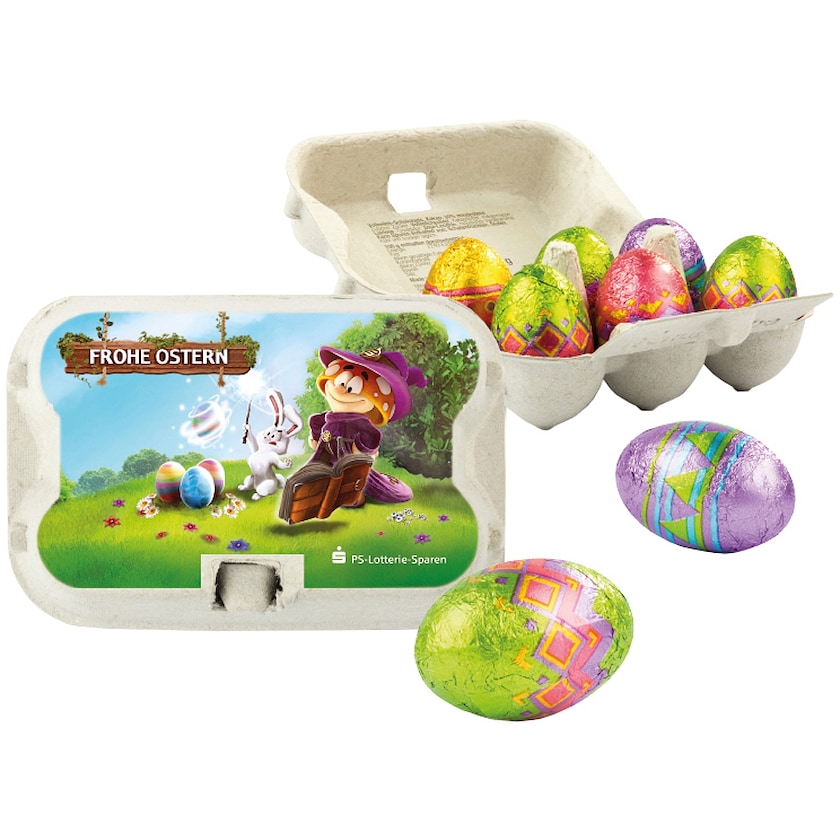Eggekartong med 6 stk sjokoladeegg. Sjokoladeeggene veier til sammen 37 gram og er laget av utsøkt melkesjokolade. Lokket på eggekartongen påføres en etikett med digitaltrykk i ditt eget design.