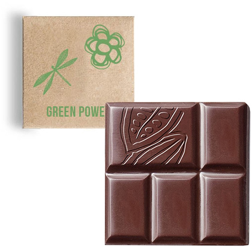 20 gram førsteklasses sjokolade innpakket i resirkulert papir. Sjokoladen er av absolutt høyeste kvalitet. Forpakningen digitaltrykkes i CMYK. Sjokoladen er vakuumpakket for maksimal mathygiene.