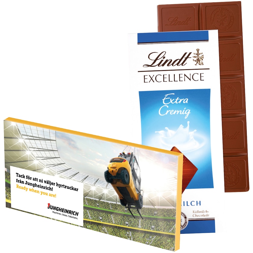 Lindt Excellence, 100 gram sjokoladeplate med forpakning i digitaltrykk. Velg mellom fire ulike smaker. Sjokoladen ligger i originalforpakningen og rundt denne er det en pappforpakning med digitaltrykk.