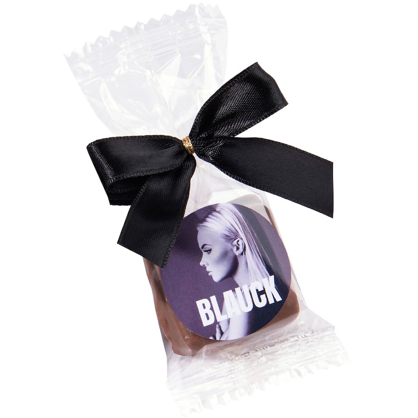 Sjokoladebit i flowpack med sløyfe. Sjokoladebiten er laget av en herlig blanding av mandel og nougat som er dekket med melkesjokolade. Et klistremerke med ditt trykk plasseres på flowpacken.