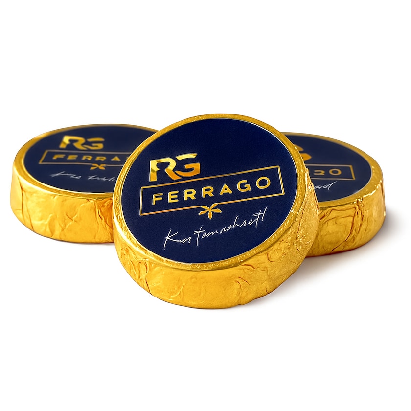Rund sjokoladebit med gullfolie. Trykket gjøres på en etikett som plasseres på oversiden. Sjokoladebiten har et kakaoinnhold på 50% og holder høy kvalitet.
