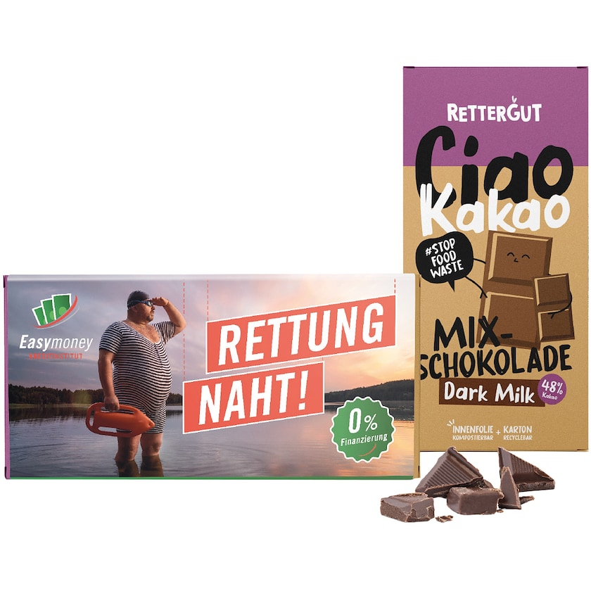 Sjokoladeplate fra Rettergut, av 100% produksjonsrester fra sjokoladeproduksjon. Sjokoladen har blitt til overs fra tidligere sjokoladeproduksjon, og ville ellers blitt kastet. Hele produksjonen er klima- og karbonnøytral. Trykket plasseres på et bånd som plasseres rundt originalforpakningen fra Rettergut.