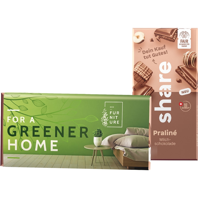 Klimanøytral og Fairtrade-merket sjokoladeplate fra Share. Sjokoladen holder høyeste kvalitet og inneholder ingen palmeolje. For hver solgte sjokoladeplate, gir Share et måltid mat til et menneske i nød. Trykket gjøres på et banner av FSC-sertifisert papir.
