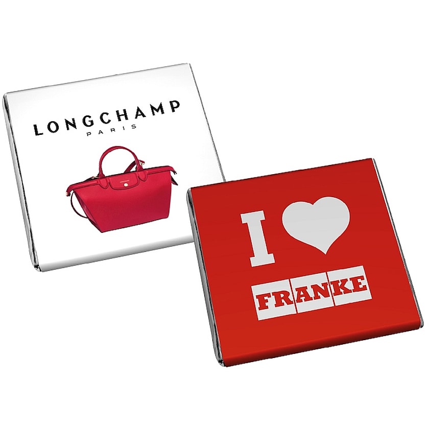 5 grams sjokoladekvadrat som kan bestilles fra kun 2000 stk. Sjokoladen er av høyeste kvalitet og finnes i smakene hvit sjokolade, mørk sjokolade og melkesjokolade. Folien kan man få i fargene sølv, gull, sort, blå eller rød. Trykket skjer med digitaltrykk.