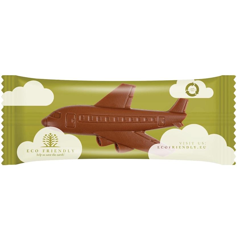 Sjokolade formet som et fly, i en biologisk nedbrytbar innpakking. Velg mellom tre ulike smaker. Innpakkingen trykkes etter dine ønsker.