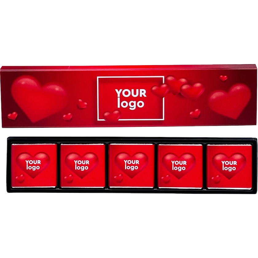 Sjokoladeeske med 5 stk. sjokoladekvadranter. Sjokoladeesken og sjokoladekvadratene trykkes etter dine ønsker. Velg mellom melkesjokolade eller mørk sjokolade.
