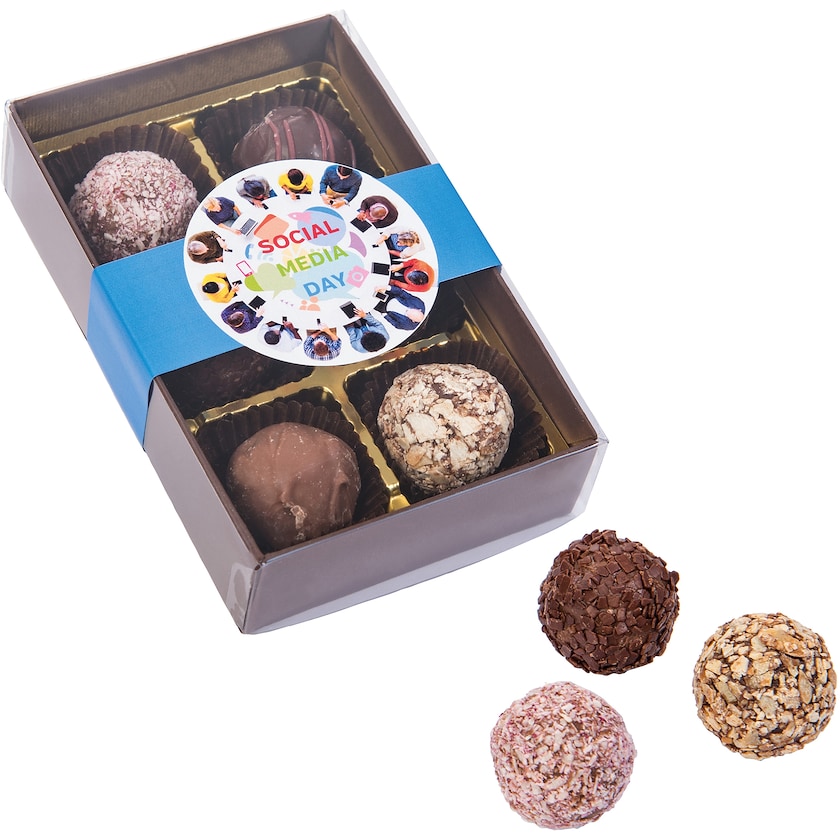 6 stk sjokoladepraliner i sjokoladeeske med transparent lokk. Sjokoladepalinerene lages på bestilling og kommer i forskjellige smaksvarianter. Sjokoladeesken påføres et bånd som trykkes etter dine egne ønsker.