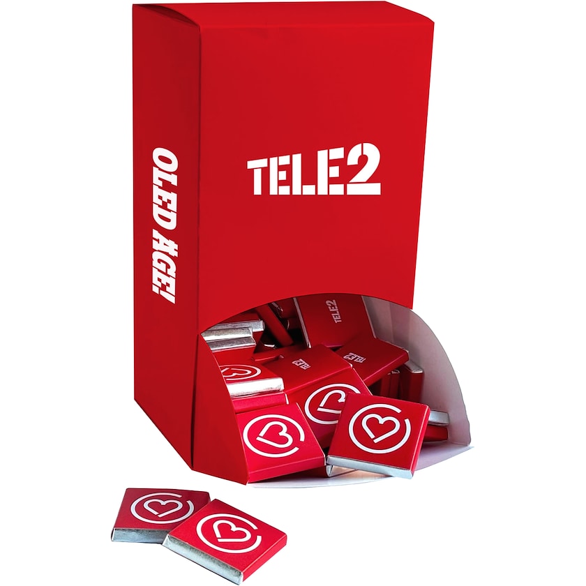 Pappeske fylt med sjokoladekvadrater. Både pappesken og sjokoladekvadratene trykkes etter dine egne ønsker. Velg mellom melkesjokolade 32% og mørk sjokolade 70%.