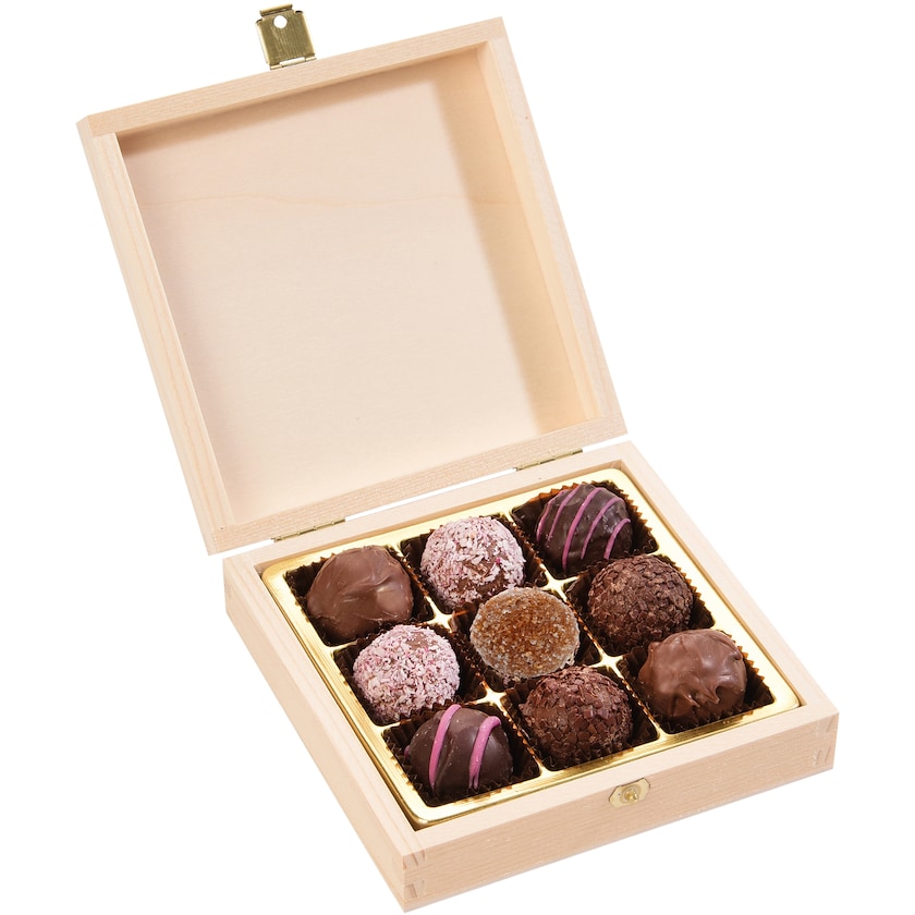 9 stk. sjokoladepraliner av belgisk sjokolade i en vakker treeske. Sjokoladepralinene lages på bestilling, noe som gjør at de er helt ferske. Leveres i ulike smaksvarianter. Lokket på treesken trykkes etter dine egne ønsker.