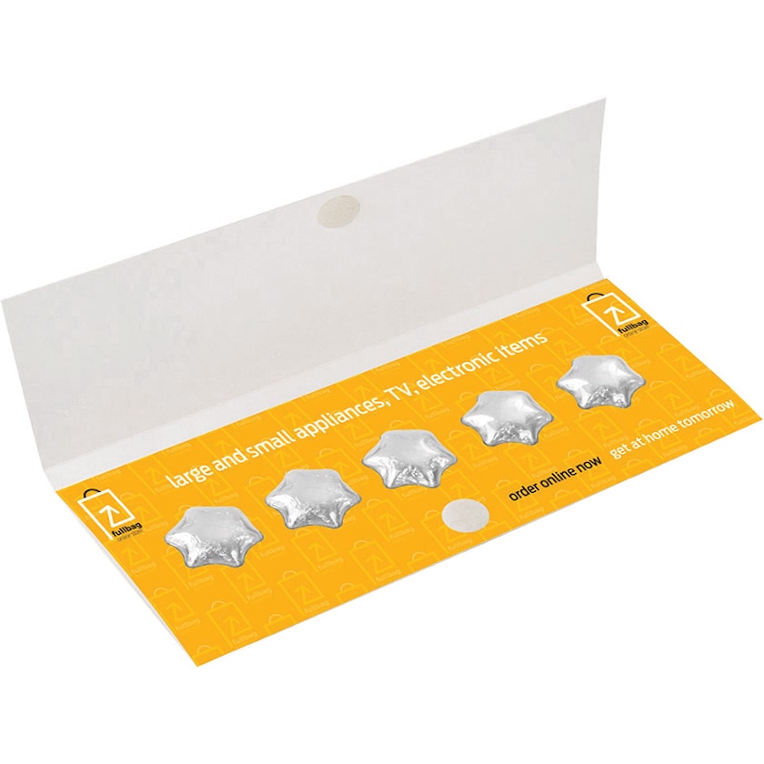 Sjokoladeeske med fem sjokoladestjerner av melkesjokolade i høy kvalitet. Hele kartongen trykkes etter dine ønsker og du kan velge mellom rød, sølvfarget eller gullfarget folie.