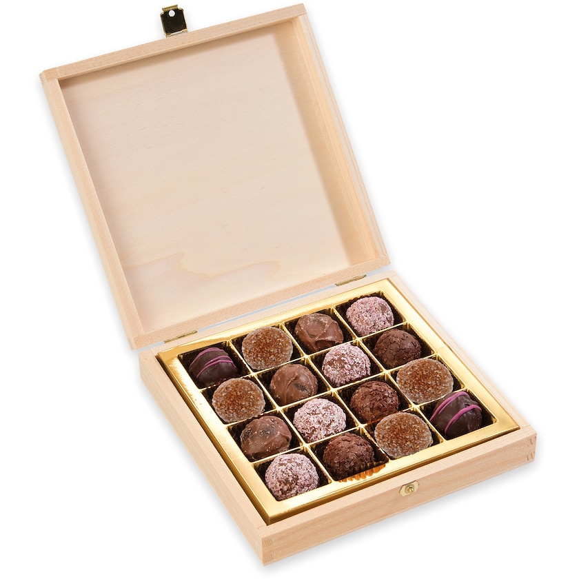 16 stk. sjokoladepraliner av fineste belgisk sjokolade i treeske. Sjokoladepralinene kommer i ulike smaker og lages på bestilling så de leveres helt ferske. Trykket gjøres på lokket til esken av tre.
