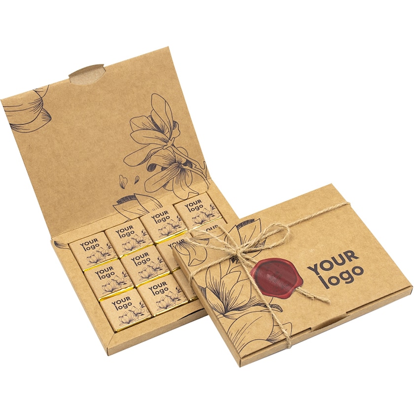 Stor naturfarget sjokoladeeske med 12 stk. sjokoladebiter. Hele esken og sjokoladebitene trykkes etter dine instruksjoner. Sjokoladebitene kan enten fås som melkesjokolade eller mørk sjokolade. Du bestemmer også om du vil ha sjokoladebitene med sølv- eller gullfolie. Sjokoladeesken utrustes med snor og klistremerke. Klistremerket har et ferdig trykk som forestiller et rødt vokssegl som, hvis du vil, kan få påført din egen logo.
