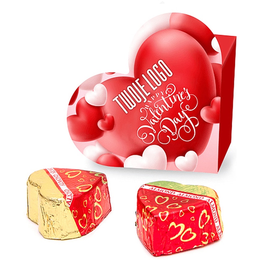 Hjerteformet sjokoladeeske som inneholder to hjerteformede sjokoladebiter. Sjokoladebitene kan fås med ulike fyll (alle bestilte sjokolader må ha samme smak). Last ned trykkmalen og skap en sjokoladeeske full av kjærlighet.