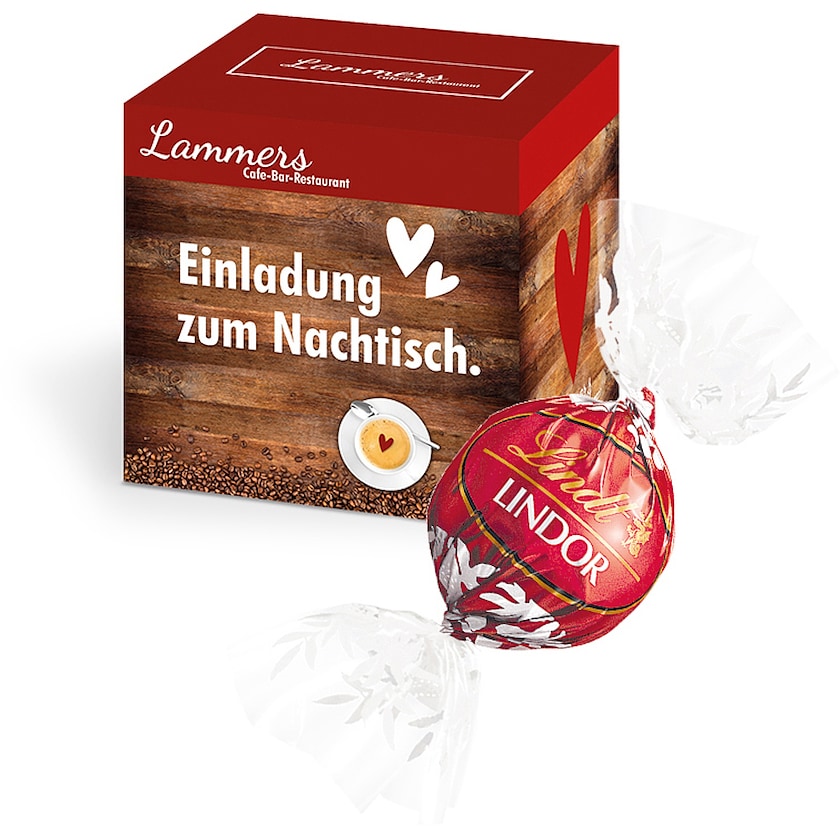 Liten pappinnpakkning med 1 stk Lindt Lindor. Pappinnpakkingen leveres helt etter ønske. Sjokoladekulene leveres i blandede smaker.