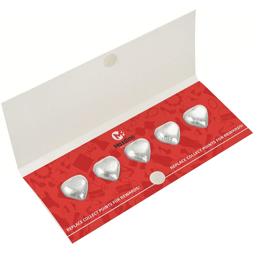 Sjokoladeeske med fem sjokoladehjerter av melkesjokolade. Hele sjokoladeesken trykkes etter dine ønsker. Velg mellom sølvfarget, gullfarget og rød farge på folien.