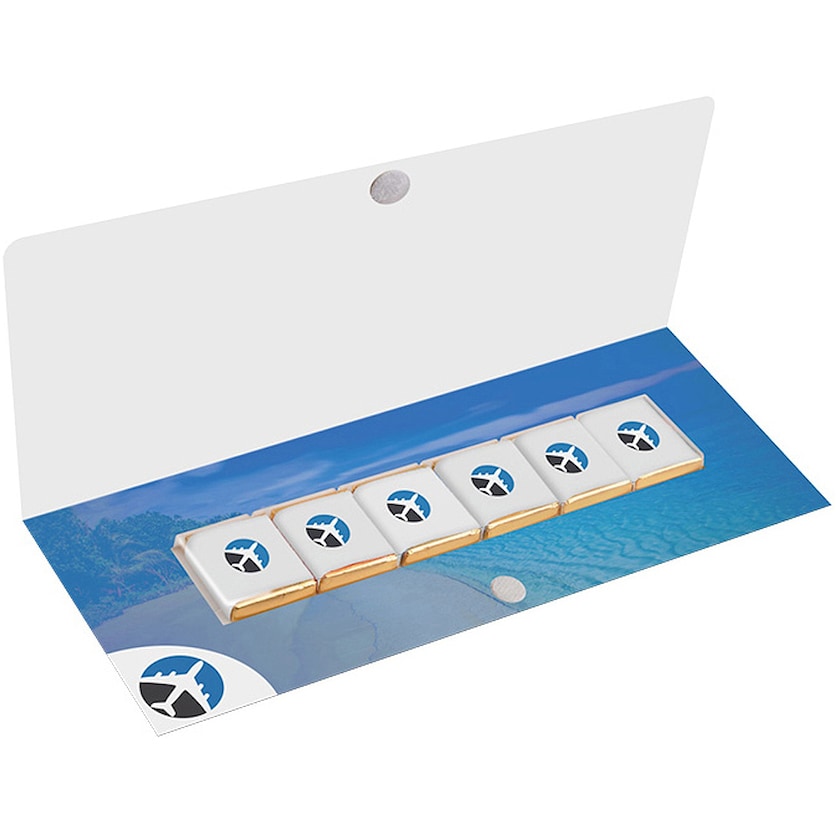 Sjokoladeeske med 6 stk sjokoladebiter. Hver sjokoladebit veier 7,5 gram og finnes i smakene melkesjokolade og mørk sjokolade (72% kakao). Folien rundt sjokoladen kan enten fås i gull- eller sølvfarge. Både sjokoladeesken og sjokoladepapiret trykkes med digitaltrykk etter eget ønske. Last ned trykkmalene og design en virkelig unik sjokoladeeske!