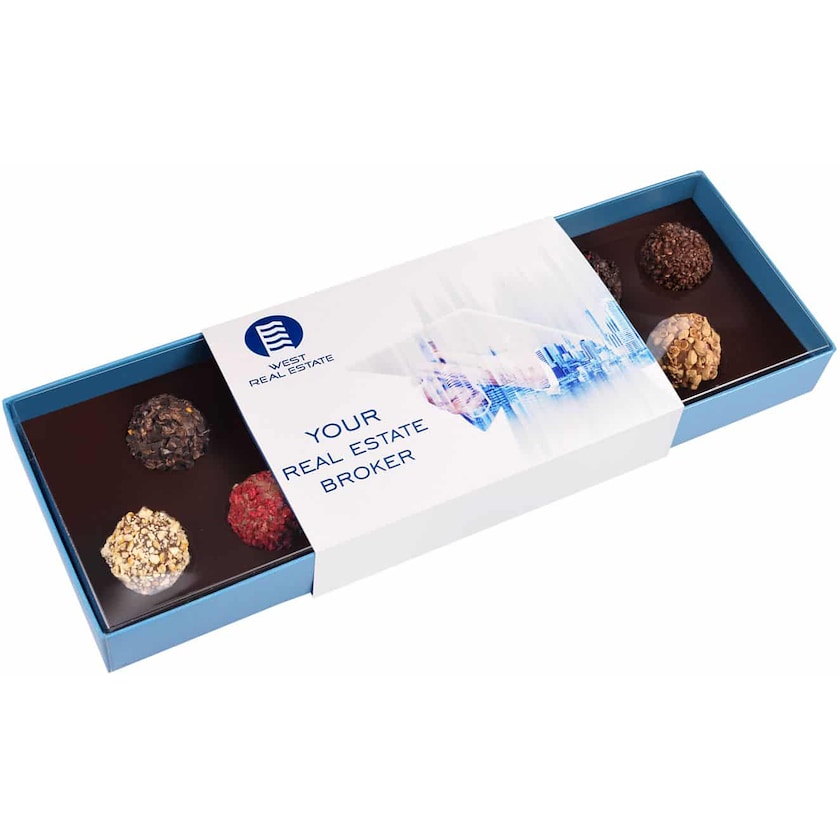 Sjokoladeeske med 12 stk. utsøkte sjokoladetrøfler. Sjokoladetrøflene kommer i forskjellig smak. Eksempel på smaksvarianter er cheesecake, tranebær, karamell og pasjonsfrukt. Trykket gjøres på et papiromslag som plasseres rundt sjokoladeesken. Du bestemmer også selv trykket både på innsiden og utsiden av pappesken.