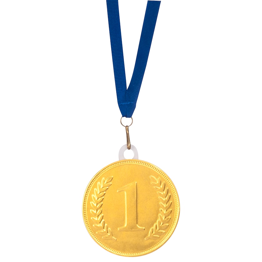 Sjokolademedalje med gullfolie med et preget 1-tall. Sjokolademedaljen er festet med et bånd slik at den kan henges rundt halsen på en verdig vinner. Inneholder melkesjokolade med minst 28% kakaoinnhold. Siden sjokolademedaljene befinner seg på lager er det kort leveringstid. Det er ikke mulig med trykk eller mer preging.
