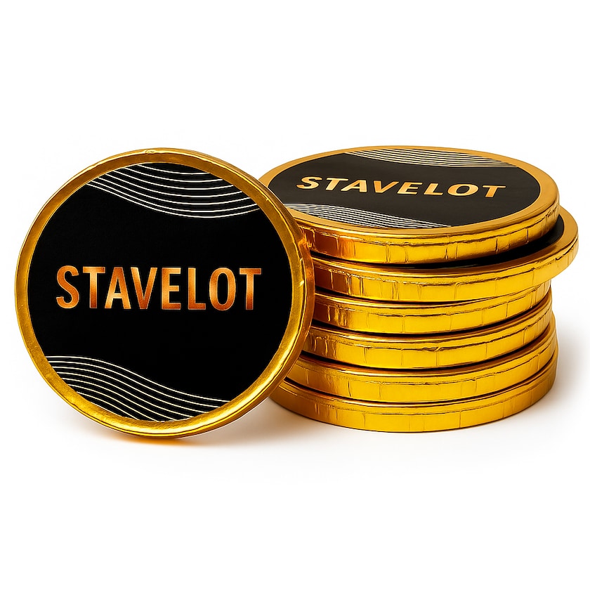 Sjokoladebit med gullfolie. En rund etikett med ditt eget trykk plasseres på forsiden. Leveres blandet i smaksvariantene melkesjokolade og mørk sjokolade.