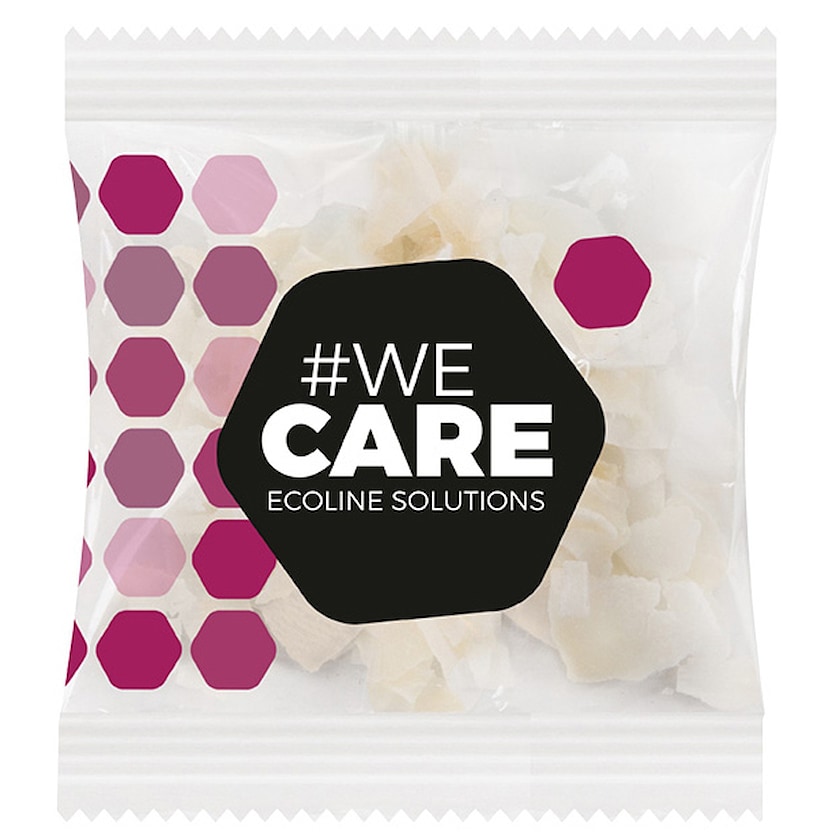Liten flowpack med chips av banan eller kokosnøtt. Et sunt alternativ! Hele innpakkingen trykkes etter dine ønsker.