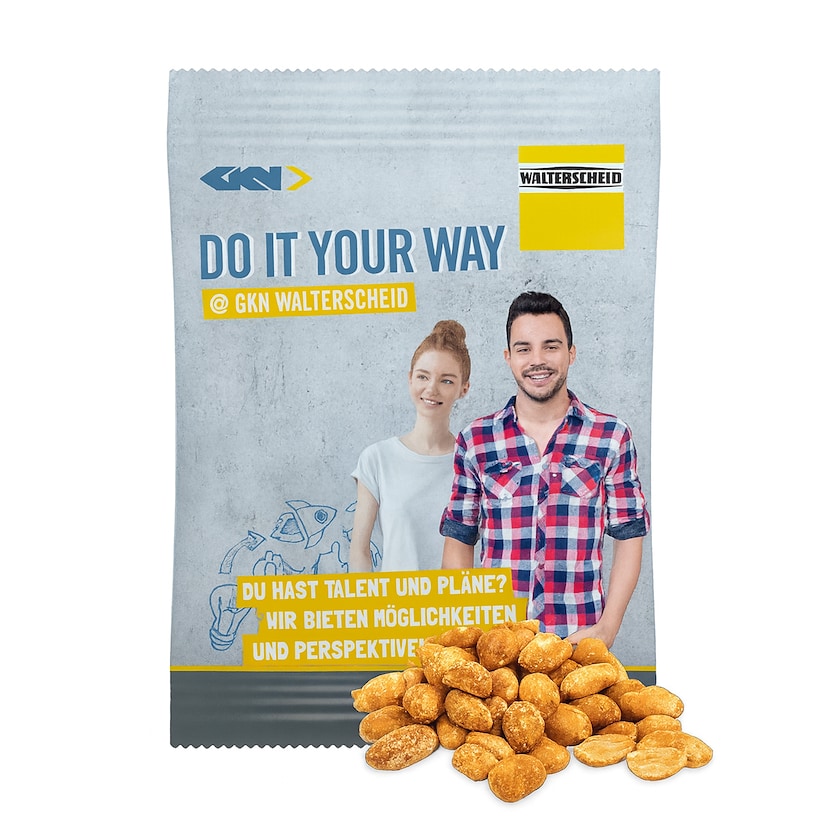 Honningstekte salte peanøtter i pose med eget trykk. Hele posen trykkes etter dine ønsker. Posen er i utgangspunktet laget av hvit plastfolie. En favoritt!