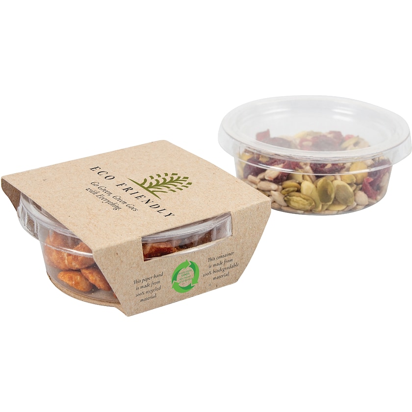 Et helseriktig mellommåltid i en biologisk nedbrytbar innpakking. Velg mellom flere ulike mikser. Innpakkingen er laget av PLA som er 100% biologisk nedbrytbart. Trykket skjer på en naturfarget papphylse som omgir innpakkingen.