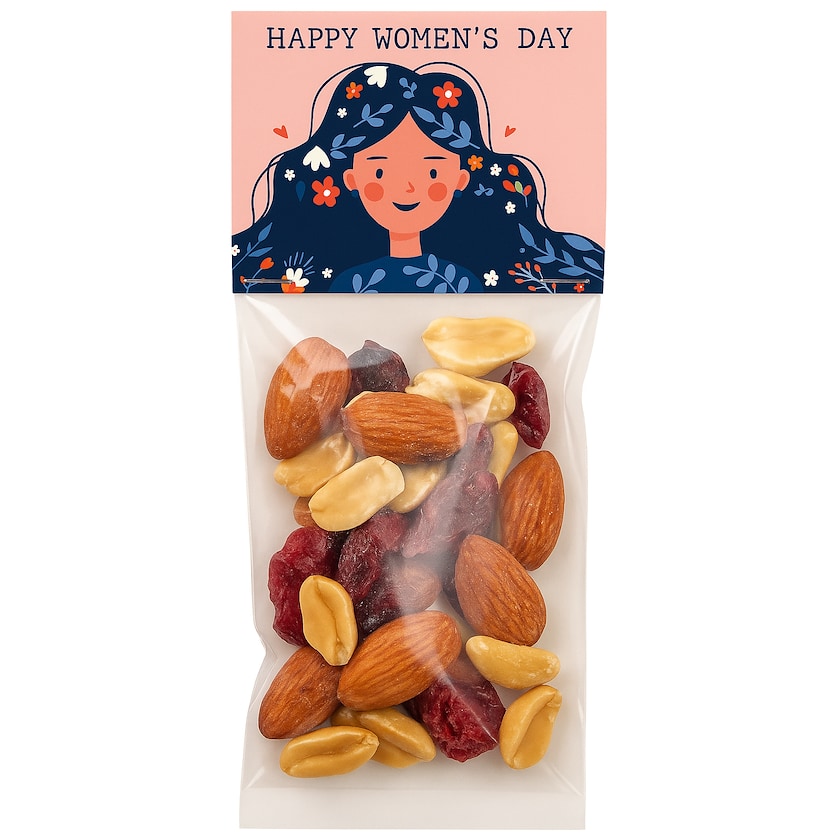 Forpakning som kan leveres med ulike typer nøtteblanding. Kortet trykkes helt etter egne ønsker. Velg mellom seks ulike nøtteblandinger.