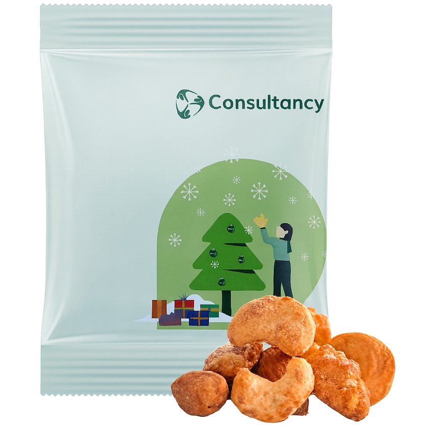 Karamellisert nøttemiks med salte innslag. Inneholder mandel og cashewnøtter som er smakstilsatt med sukker, kanel, bourbonvanilje og salt. Hele forpakningen trykkes etter dine ønsker.