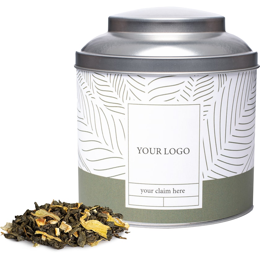 100 gram te i metallboks. Det festes en etikett rundt metallboksen som trykkes helt etter egne ønsker. Velg mellom to herlige tesorter. Sunny Gardener en grønn te med innslag av sitronskall, appelsinskall, ananas, solsikke- og ringblomstblader. Orange Dream er en Earl Grey -te med innslag av appelsinskall.