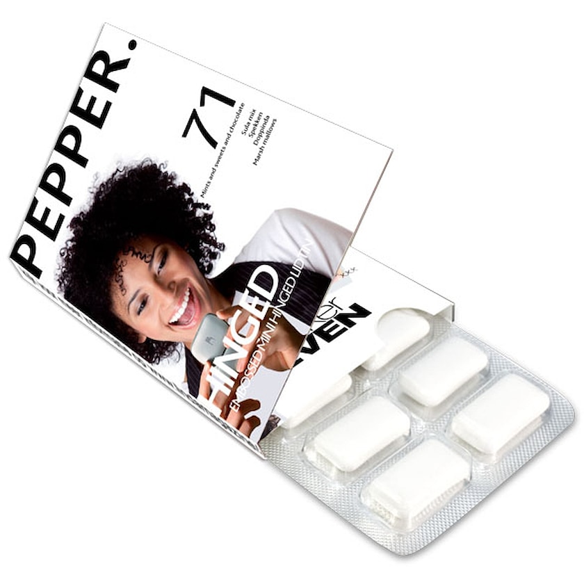 12 stk sukkerfrie minttyggegummi med xylitol. Forpakningen har ekstra omslag. Perfekt for reklametrykk.