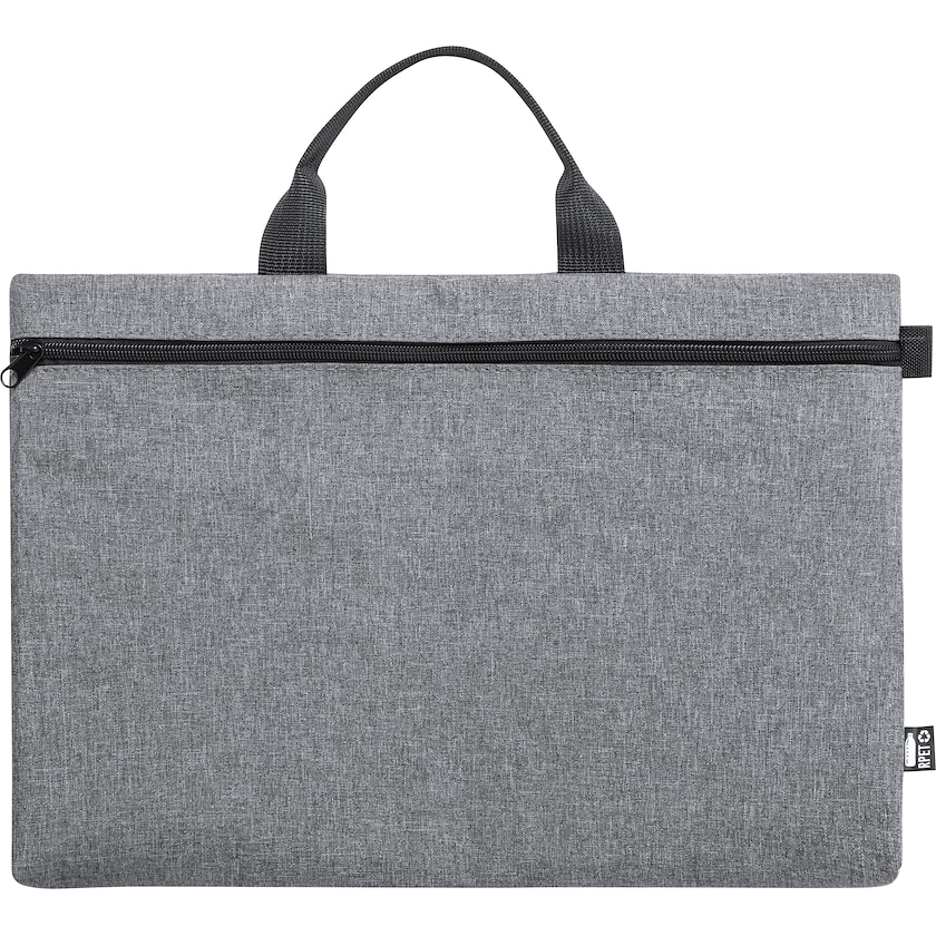 Miljøvennlig dokumentveske av RPET. Vesken har en hovedlomme med glidelås. På siden er det en etikett som viser at vesken er produsert av RPET. Materialet RPET produseres av resirkulerte PET-flasker.