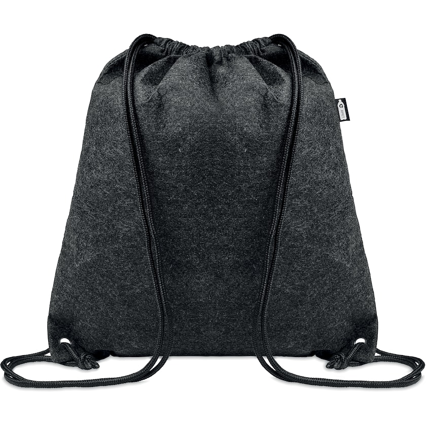 Miljøvennlig gympose av filt. Stoffet er laget av RPET (resirkulerte PET-flasker) og snorene av polyester. Det er en etikett på den ene siden som viser at stoffet er av RPET.
