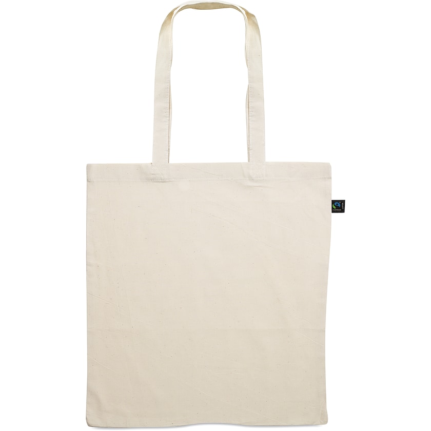 180 grams bomullspose av Fairtrade-sertifisert bomull. Posen har lange håndtak. Kan kjøpes fra bare 50 stk. På den ene siden av bomullsposen er det en etikett som viser at den er laget av Fairtrade-sertifisert bomull.