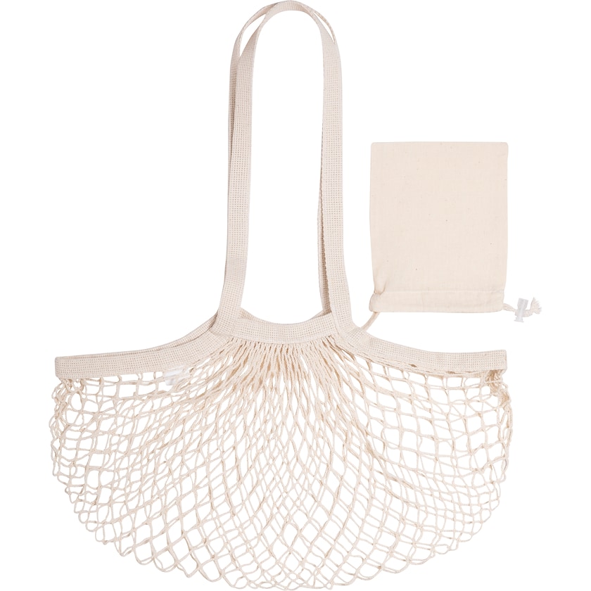 Handlenett i naturfarget bomull. Når handlenettet ikke er i bruk, foldes den sammen og oppbevares i den inkluderte oppbevaringsposen. Trykket gjøres på oppbevaringsposen.