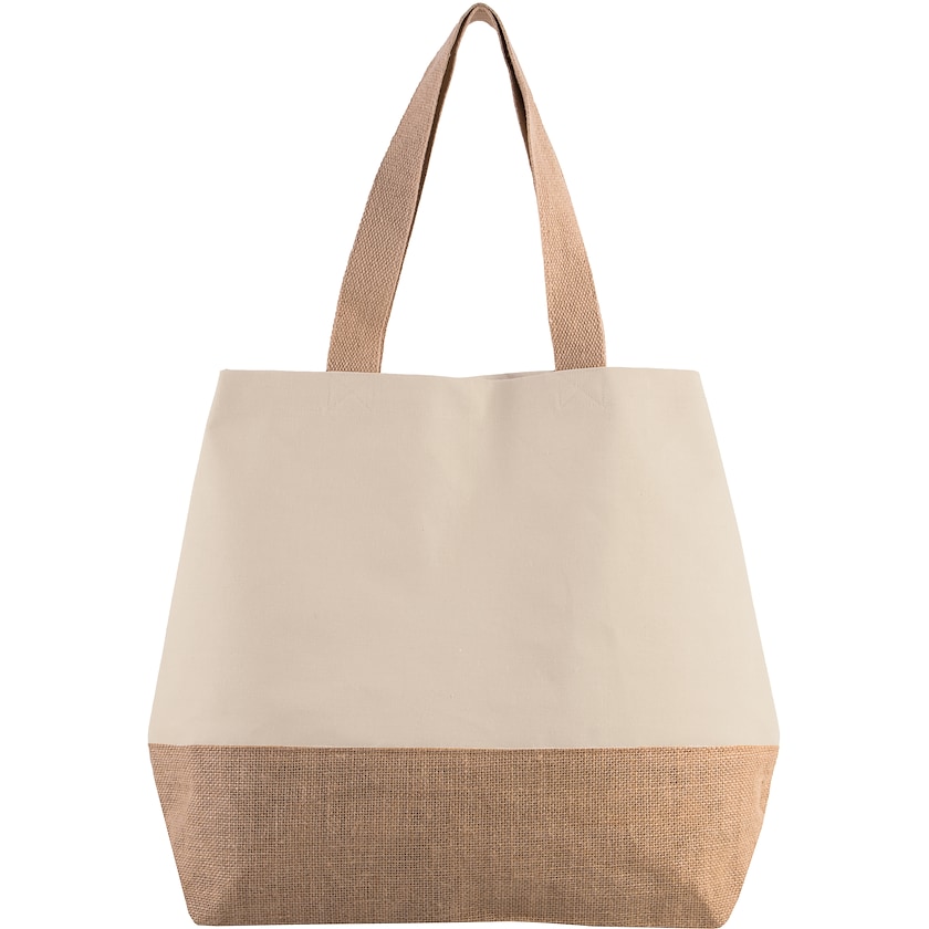 Stor bomullspose med nederdel av jute. Innvendig finnes en glidelåslomme. Håndtakene er 55 cm lange. Posen holdes stengt med hjelp av en magnetisk knapp.