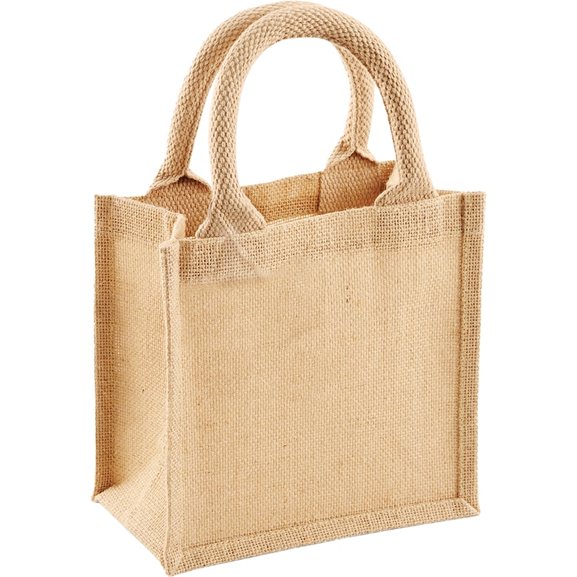 Liten jutepose som passer perfekt når man skal gi bort gaver. Juteposen har laminert stoff for økt styrke. Håndtakene er av bomull. Om flere farger skal trykkes kan de ikke røre hverandre.