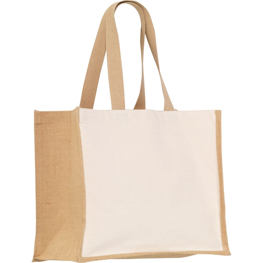 Jutepose med detaljer av bomullskanvas. Posen har lange håndtak. En solid jutepose av høy kvalitet.