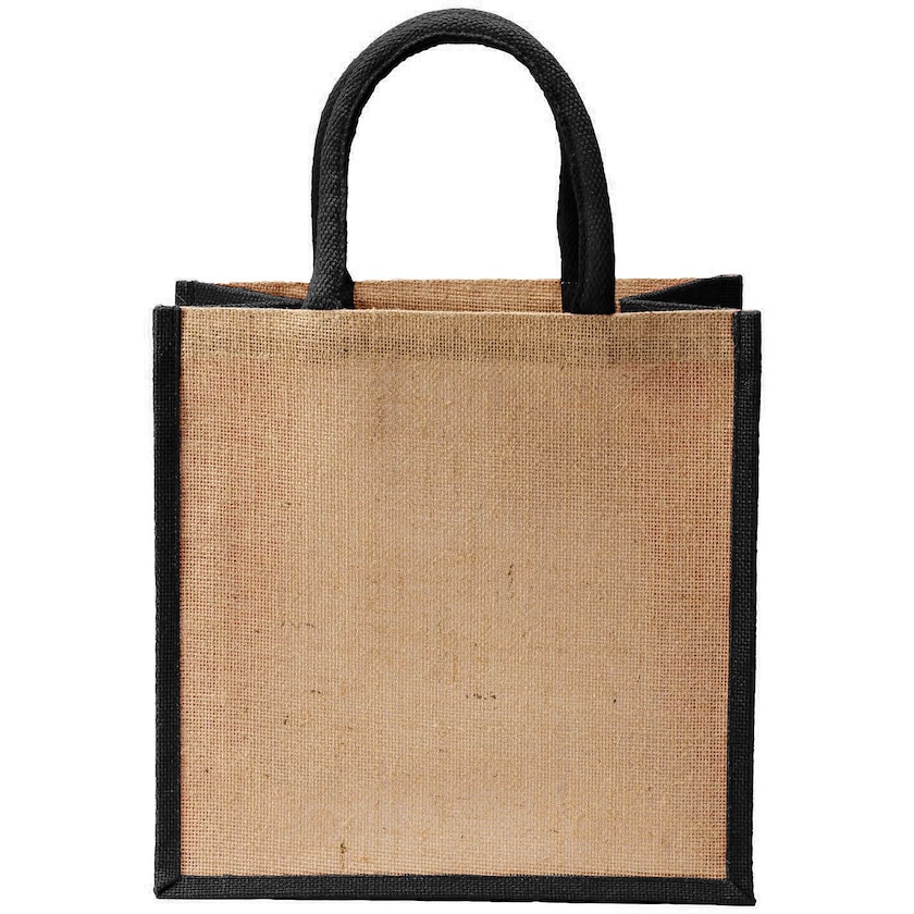 Liten jutepose med fargede håndtak og detaljer. En perfekt pose når du skal gi bort giveaways.