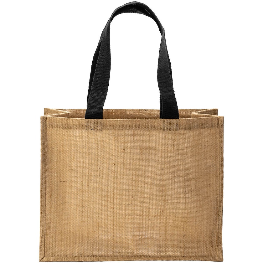 Jutepose med lange fargede håndtak. Posen har bred bunn, noe som gjør den ekstra romslig.