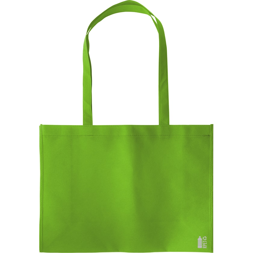 Miljøvennlig non-woven pose med bred bunn og lange håndtak. La Vista er laget av RPET, dvs. resirkulert PET. Det er et symbol i det ene hjørnet som viser at den er laget av nettopp RPET.
