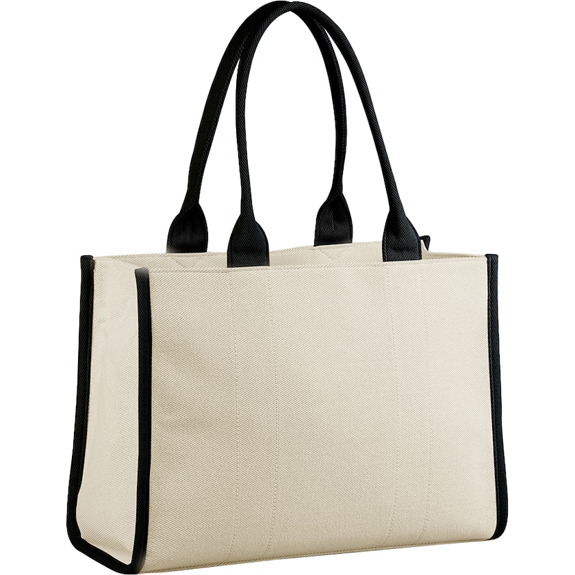 Luksuriøs strandveske med kraftig stoff. Innvendig er det en lomme med glidelås. Kan både bæres over skulderen og i hånden. Stoffet er laget av en solid blanding av bomull og polyester. Fôret er produsert av resirkulert polyester.
