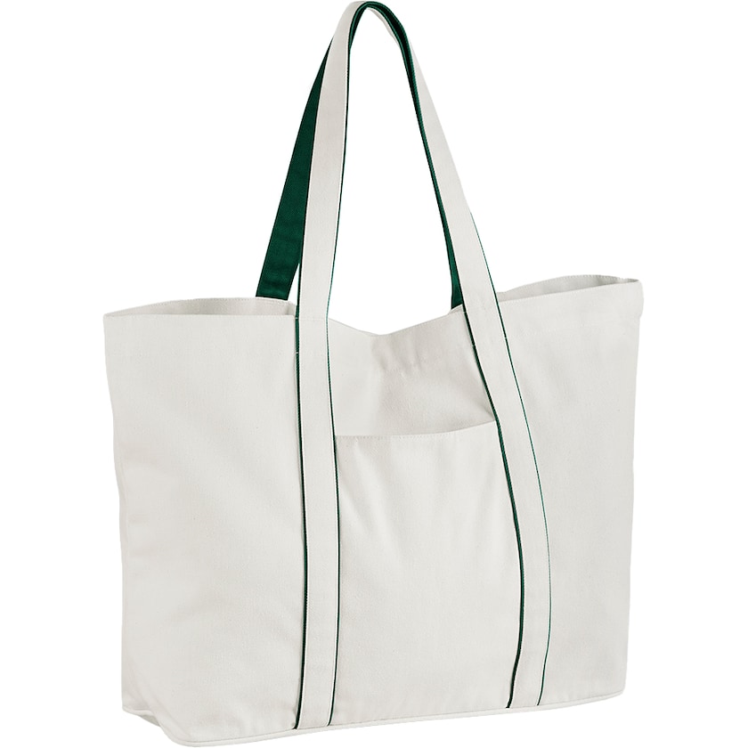 Miljøvennlig strandveske av kraftig bomullsstoff. Hovedrommet lukkes med magnetlås. På utsiden er det en skjult lomme til verdisaker. Vesken kan både bæres på skulderen og i hånden. Stoffet veier 407 gram/m2 og er laget av 70% resirkulert bomull og 30% resirkulert bomull.